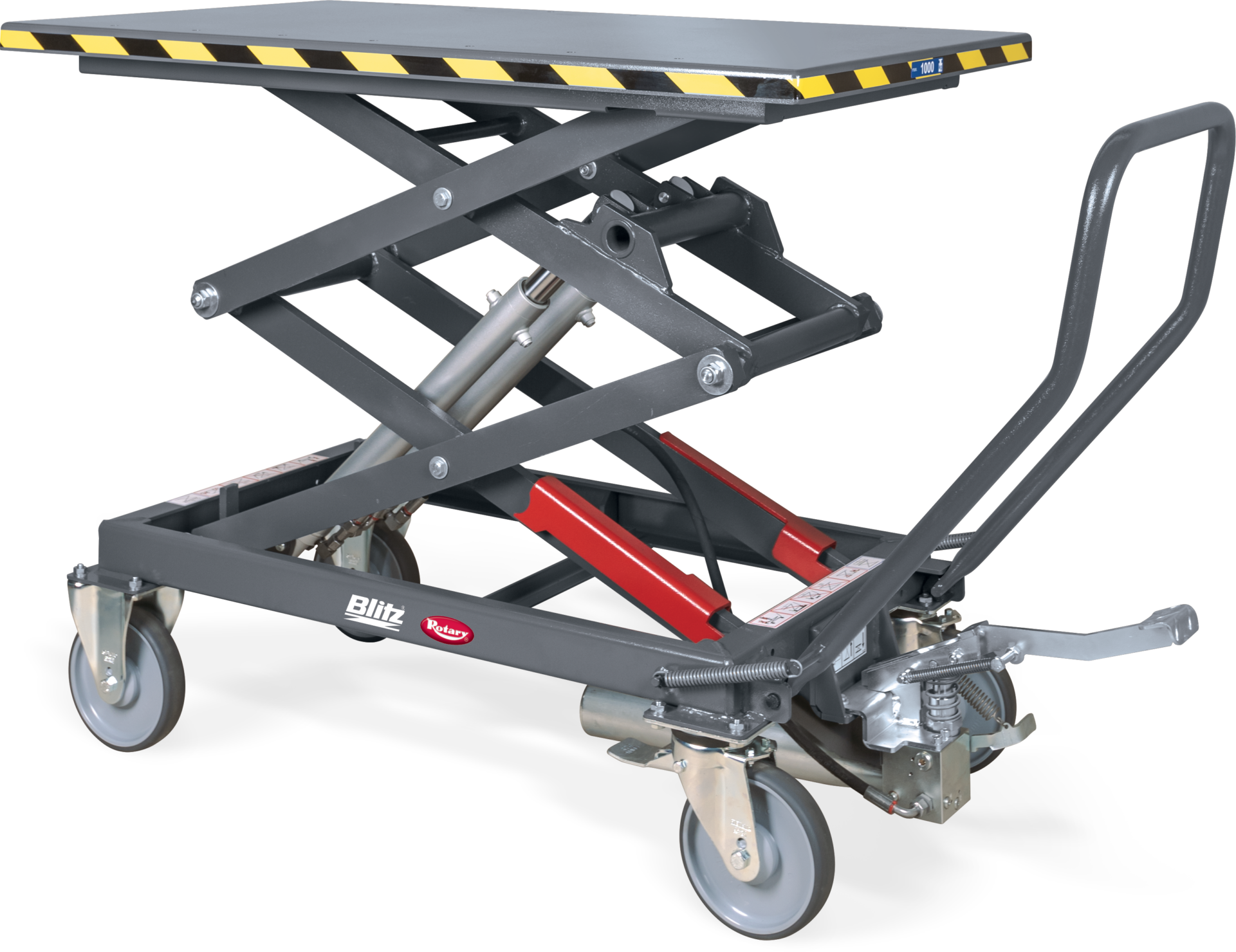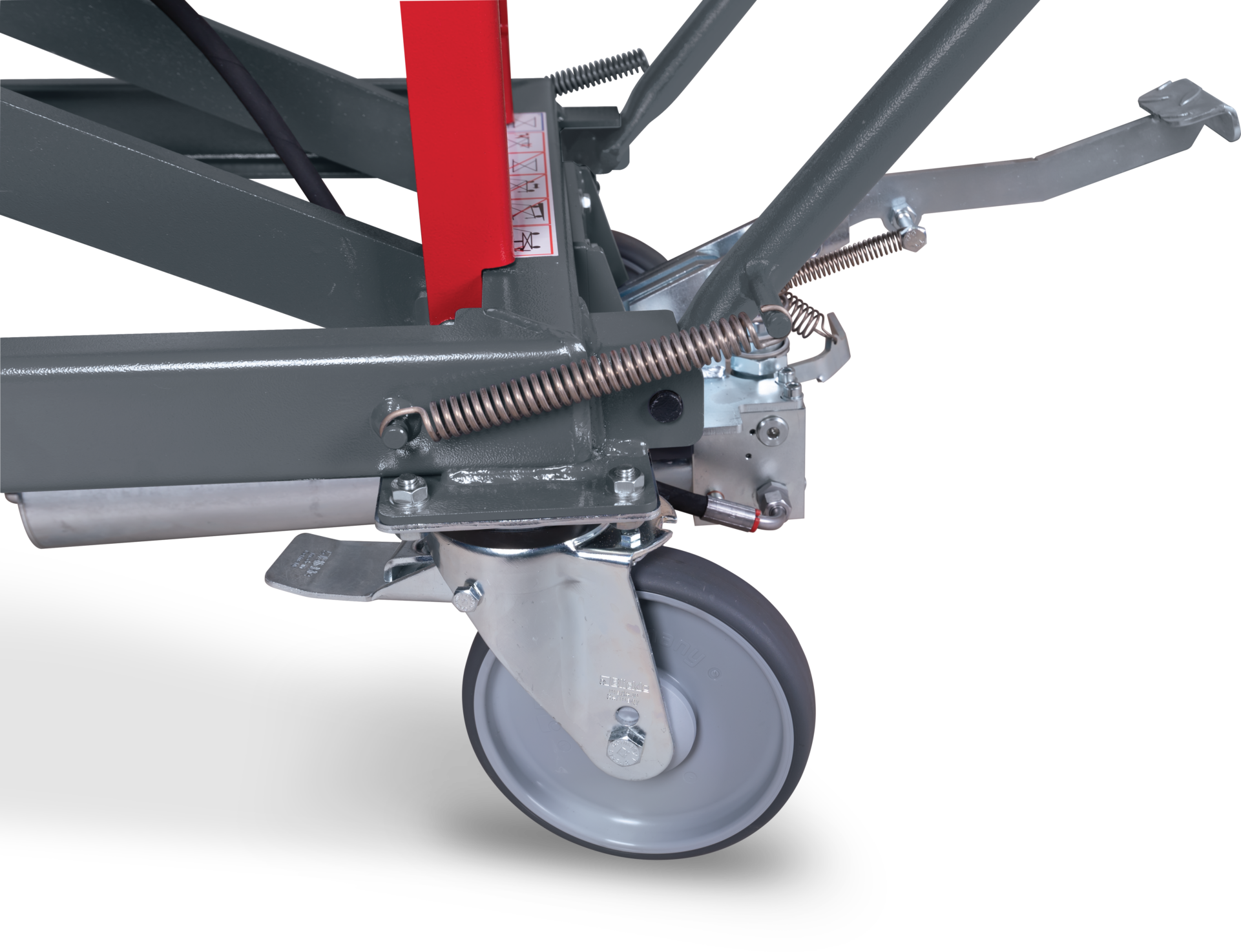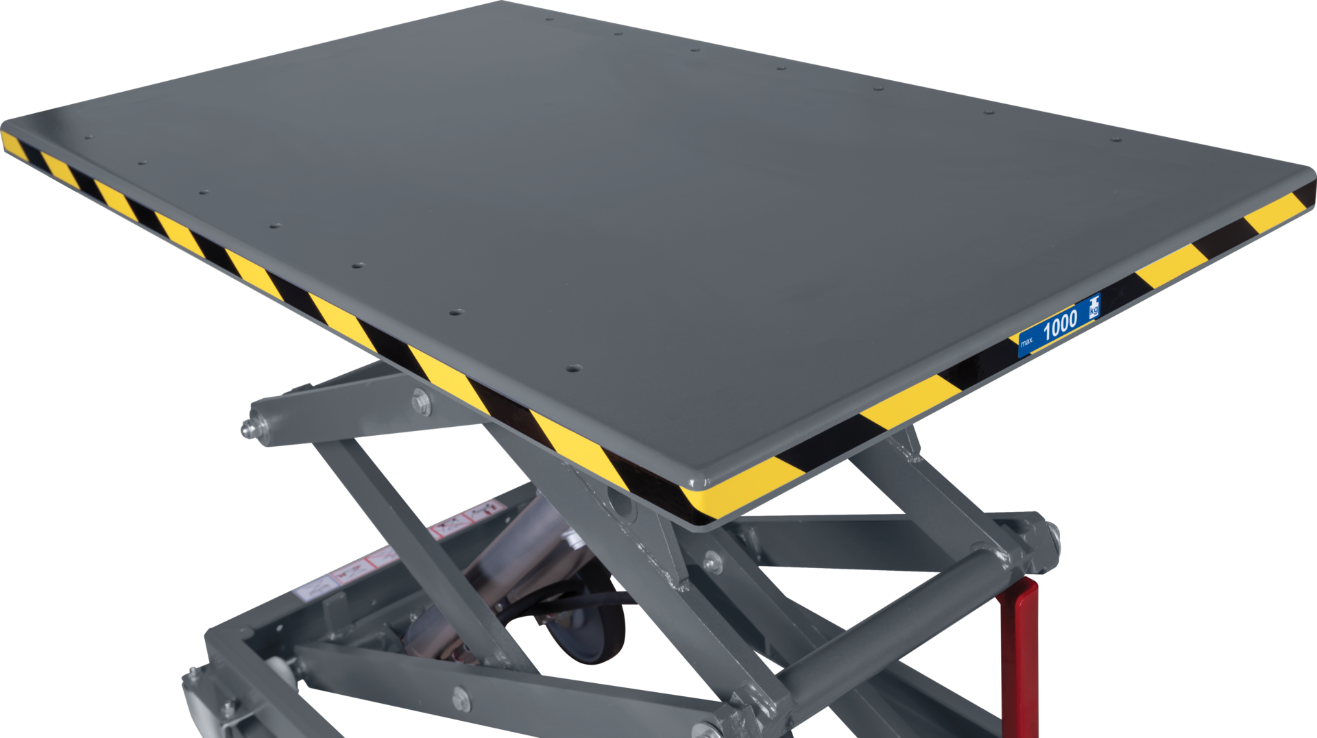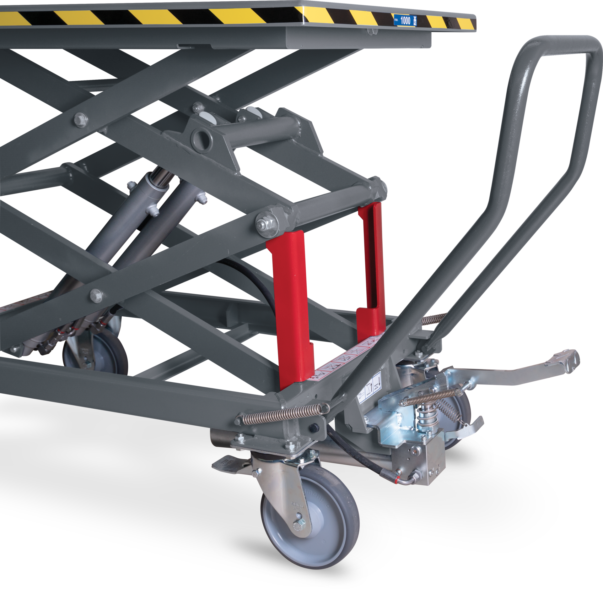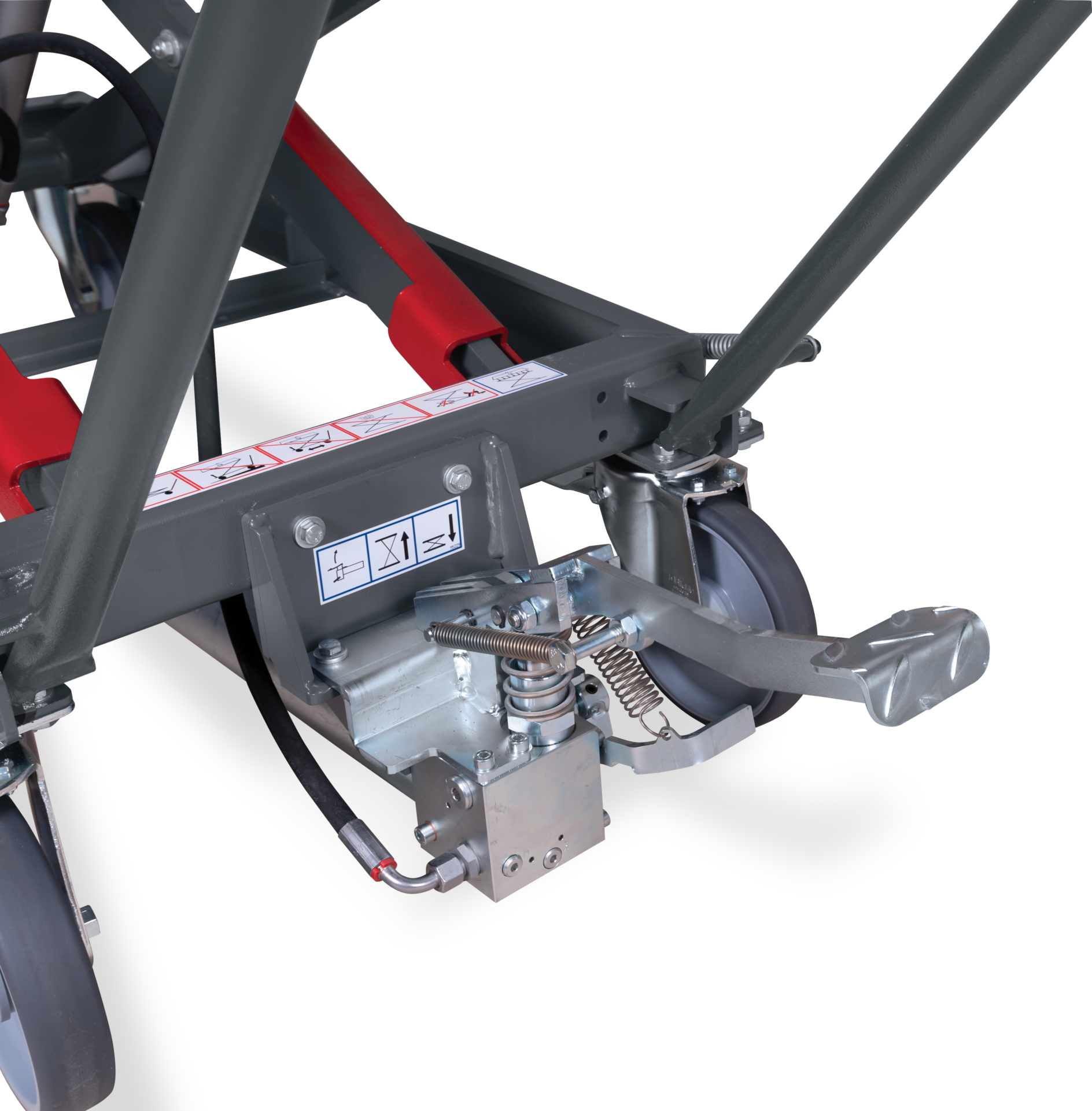 - The hydraulically controlled lifting load stroke, which is activated by foot using a floor-mounted button, triggers the double-acting pump that ensures lifting any load quickly and effortlessly – The integrated lowering brake valve allows an exact dosing of the lowering speed.