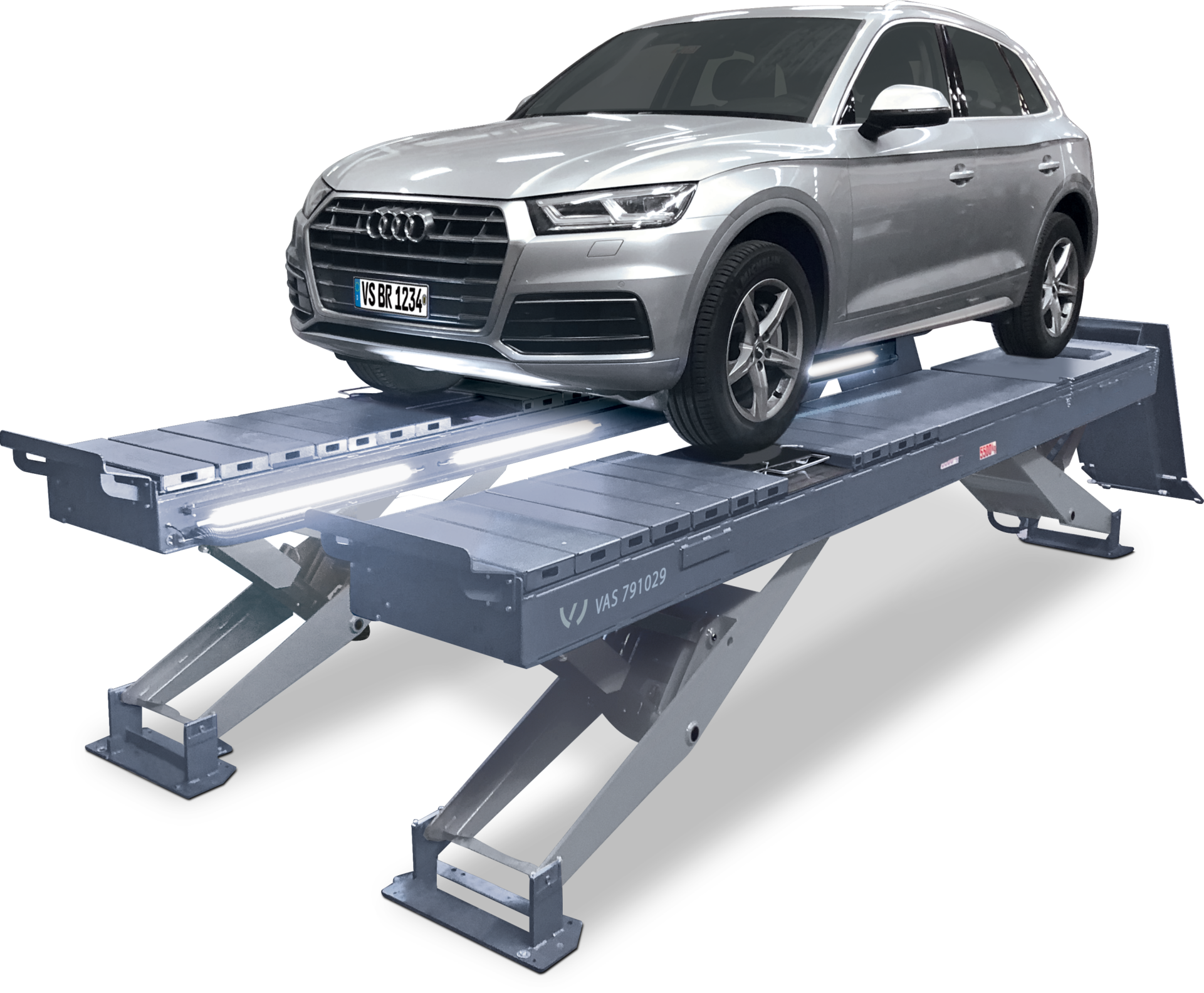 - The lifting scissors engage close to the wheel contact area and thus give the lifting platform a very high stability. In conjunction with the precisely crafted and reinforced tracks, it meets the specifications of the VOLKSWAGEN AG.