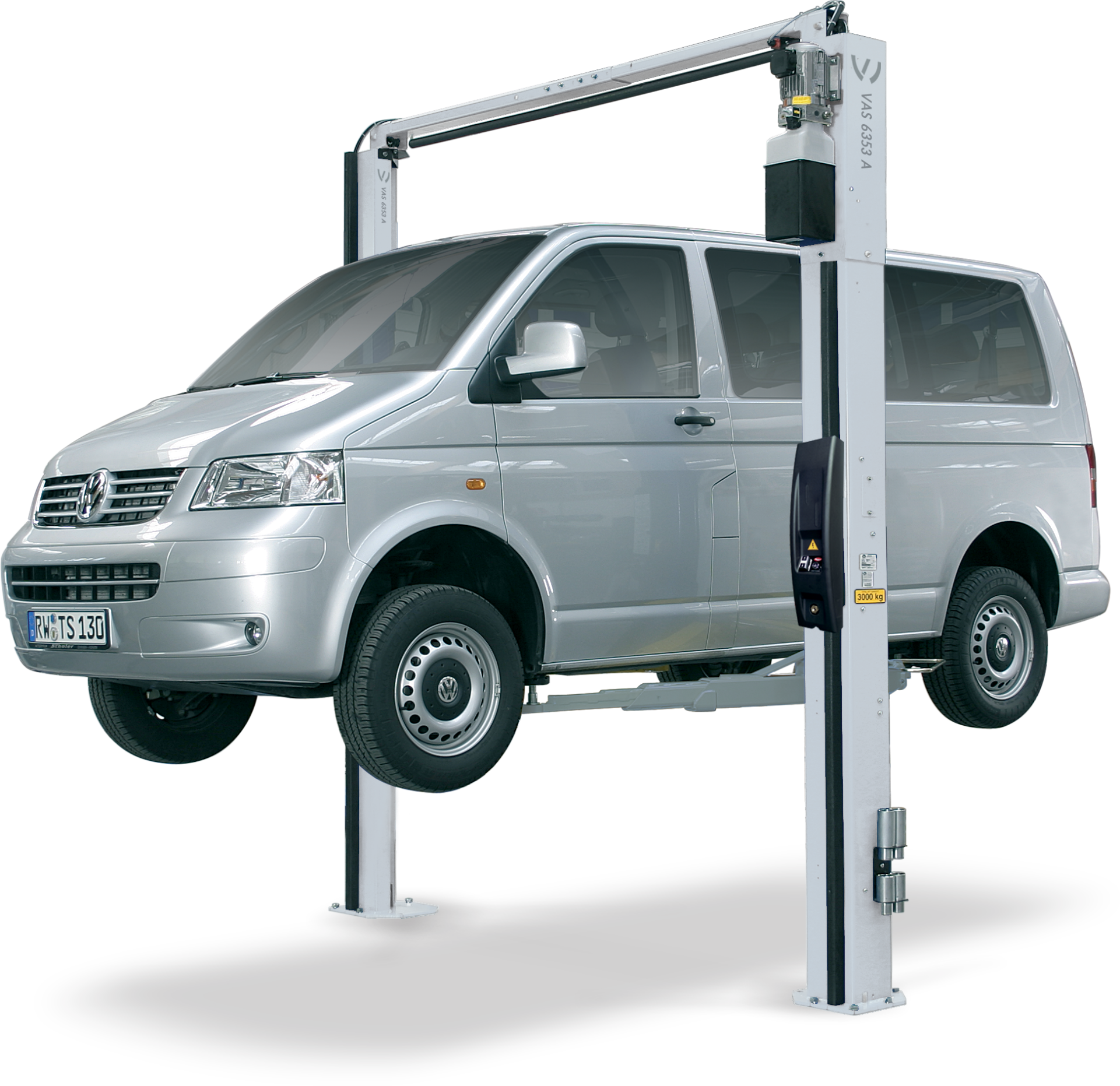 Los elevadores de 2 columnas electro-hidráulicos de la serie VAS 6353 A convencen por un área de recogida sobresaliente. El sistema de control está disponible en versión manual y eléctrica.VAS 6353 A ofrece un alcance de recogida flexible desde UP! a furgonetas grandes (p. ej. VW T6 largo) debido a su diseño asimétrico