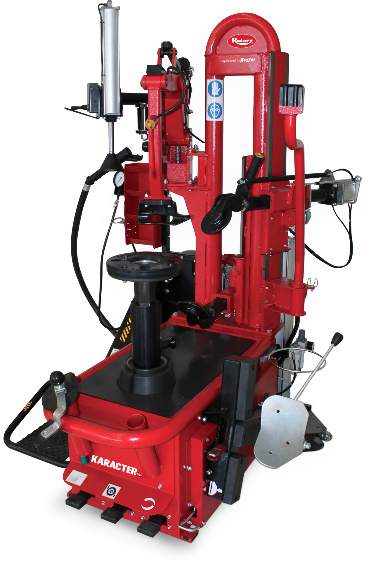Desmontadora profesional de neumáticos de coche y camión ligero con bloqueo centrante, con útil de montaje de plástico patentado. Ergonómico y rápido, gracias a la combinación de destalonadores de rodillos y destalonador lateral. Idóneo para todo tipo de combinación de neumáticos.