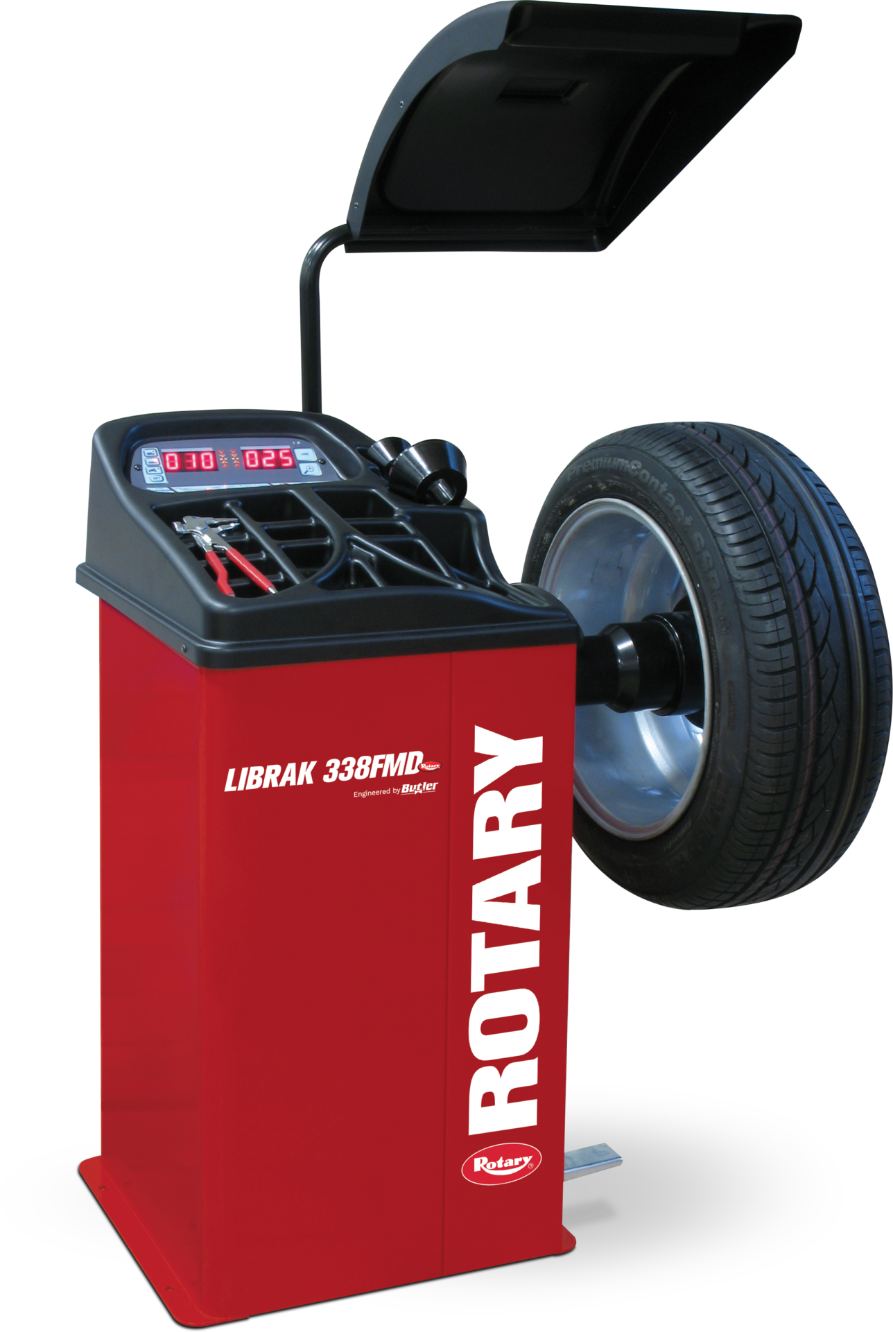 Pantalla gráfica LCD retroiluminada (132 x 40 mm), detección automática de distancia y diámetro, ciclo automático, freno para rueda, incl. conos para turismos, carter protección de rueda y garra rápida, turismo, diámetro de llanta 10 – 26″ | Rojo (RAL 3002)