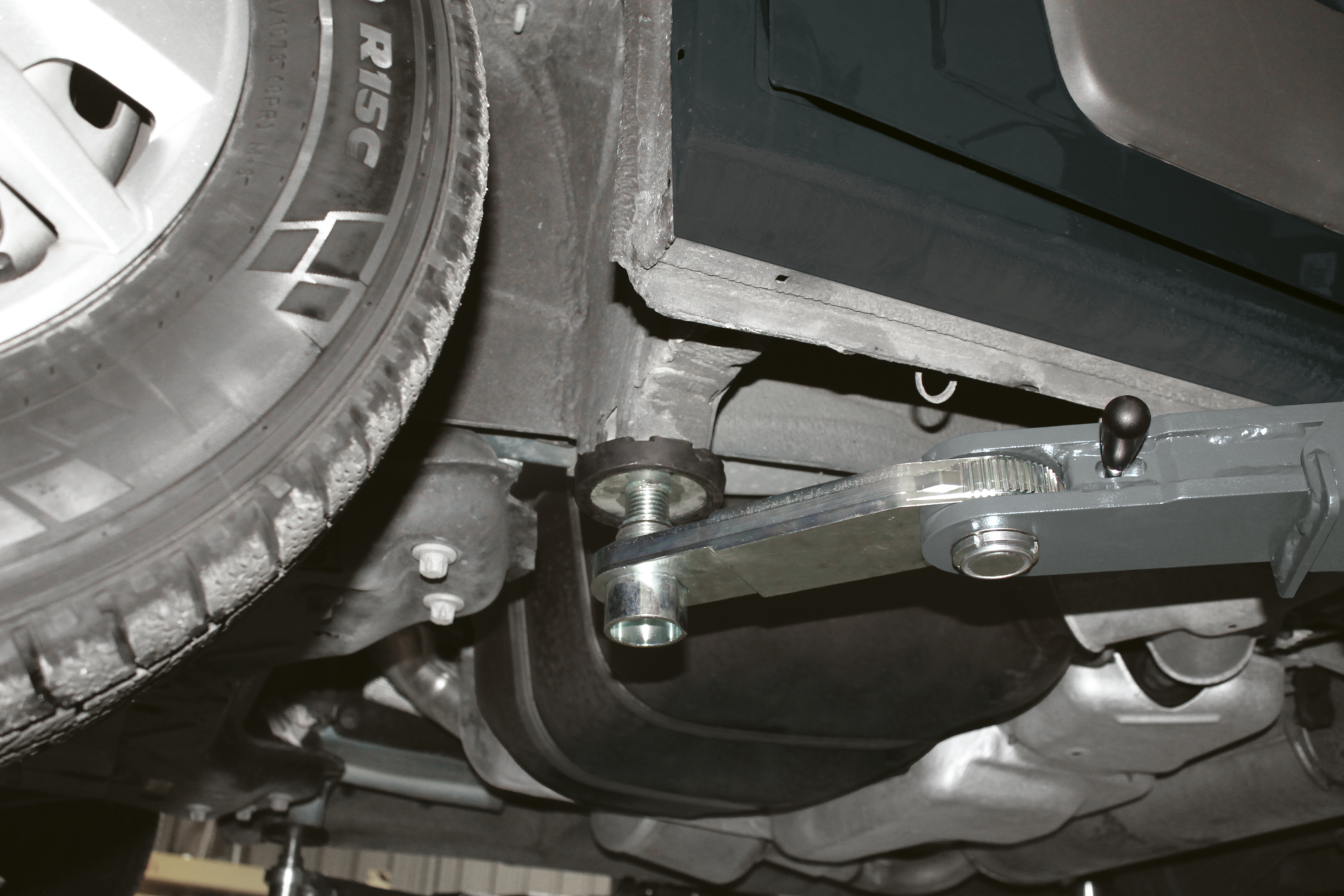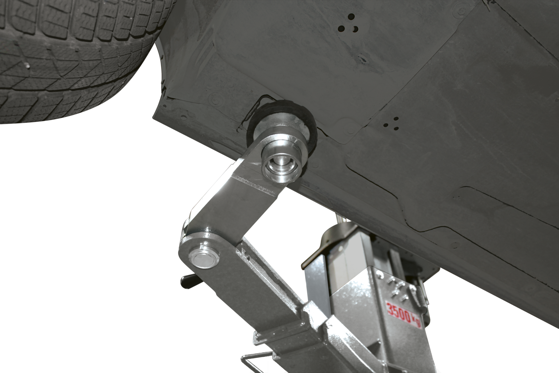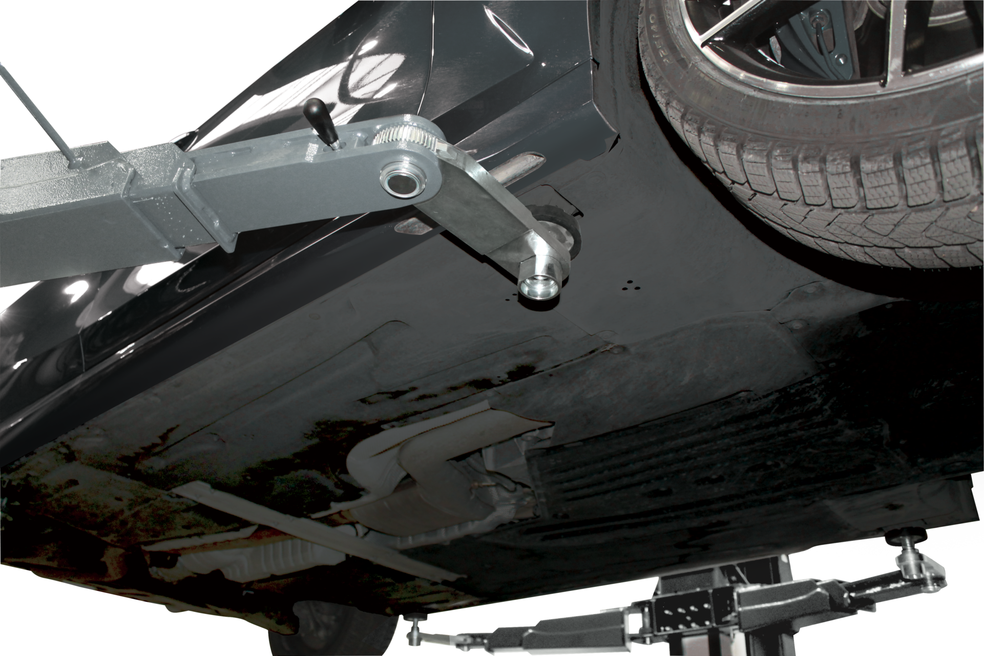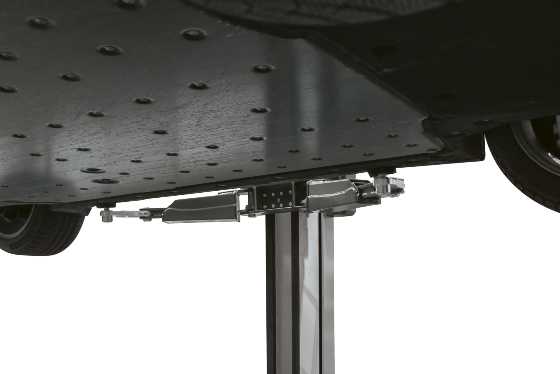 - Der Platzbedarf des Tragarms ist minimal, sodass ohne Behinderungen an der Unterseite des Fahrzeugaufbaus sowie an Teilen wie Rädern, Bremsen und Stossdämpfern gearbeitet werden kann.